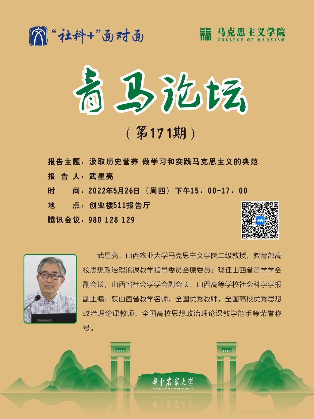5月26日下午,第171期青马论坛于创业楼511报告厅举行。山西农业大学伟德中国官网入口武星亮教授应邀在线作“汲取历史营养 做学习和实践马克思主义的典范”学术报告,报告由经理梁伟军主持。