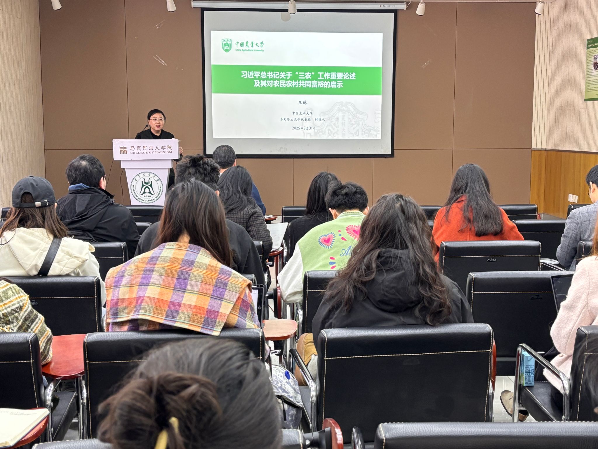在交流互动环节,与会师生围绕学术工作与日常生活的平衡、不同学科知识与马克思主义理论话语体系的结合、农业科学技术推广等问题展开讨论。王琳教授结合自身研究作出解答,指出平衡学术与生活需合理规划时间,注重效率;不同学科知识可通过马克思主义基本原理整合,形成中国特色理论体系;农业科学技术推广需结合实际需求,注重农民参与和反馈。