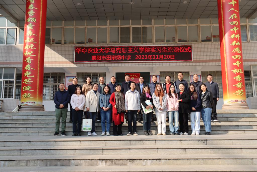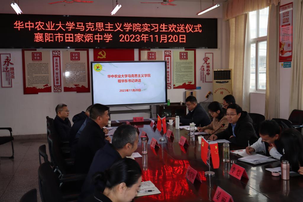 田家炳中学党委书记秦选峰在致辞中充分肯定六名实习生在过去六周中的实习表现,指出实习生们传承华农优良校风,把大学积累的扎实专业学识灵活运用到实习工作中,并把大学的思政之道沉浸式传递给田中学子。实习生们将华农“勤读力耕、立己达人”的校训精神与田中“敦品励学,己立立人”的校训精神高度契合在一起,一样的青春展现了异样的精彩,为田家炳中学思政课学科的建设奉献了青年老员工的青春和智慧。秦书记回顾了一年来华农和田中大中小思政课一体化共同体建设的历程,并表示希望未来华农继续牵手襄阳田中,共同推动大中小学思政课一体化建设向纵深方向发展。