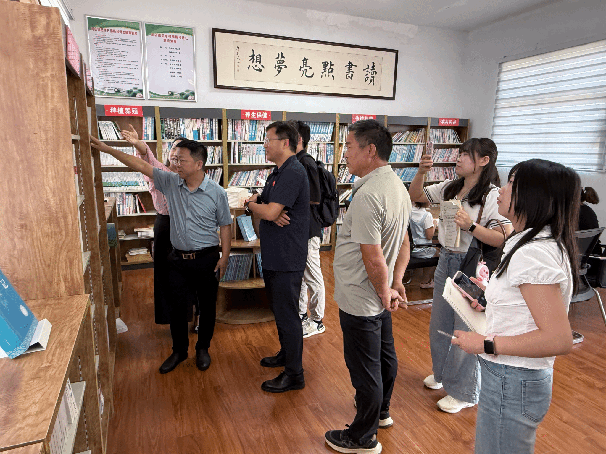 8月11日上午,调研团队一行人在闹店镇党委书记魏书记的带领下,来到了闹店镇后李村。步入村中大家便被一幅幅诗词书法作品所吸引,这些作品皆出自于后李村的“柳杨河诗社”。依托于后李村的“梦想书屋”以及文化能人的支持, 2023年成立了具有浓厚村域色彩的“柳杨河诗社”。从前,村民们干完农活不是串门拉家常就是在家看电视。柳杨河诗社成立之后,在村干部和文化能人的带领之下组织了丰富的文化活动,有诗词创作分享会、乡村振兴演讲比赛等,大家聚集在一起写诗词、学书法,当地的诗词专家、学者还会定期进村授课,组织开展诗词交流会。柳杨河诗社的活动极大地丰富了村民的精神文化生活,为乡村文化发展注入了新鲜活力,以文化之匙打开了乡风文明建设的新画卷。