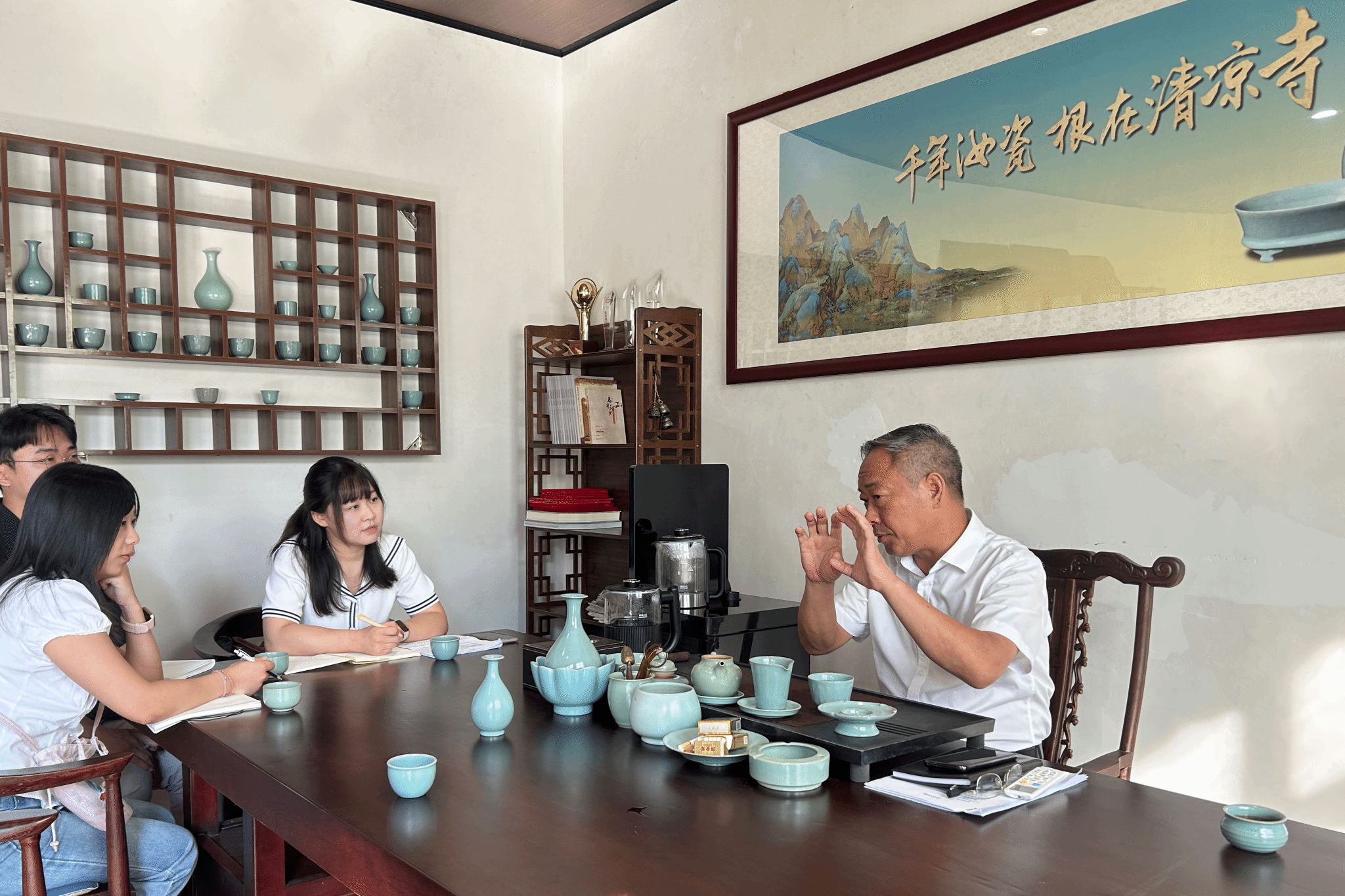 8月11日下午,在清凉寺党支部书记王学峰的带领下,调研团队一行人来到了宝丰县大营镇清凉寺村,深入感受到了“雨过天晴云破处,这般颜色作将来”的汝瓷之美。据王书记介绍,近些年来清凉寺村的汝瓷产业正以蓬勃之势带动乡村发展迈向新台阶,而这一切的背后,离不开党建的引领。在以村“两委”班子、党员队伍、群众代表以及人才队伍形成的合力之下,清凉寺村依托汝官窑遗址及汝瓷产业的发展,加快推动“日用品艺术化,艺术品日用化”,努力打造“非遗传承 + 规模化生产 + 体验活动”三轨并行的发展模式。