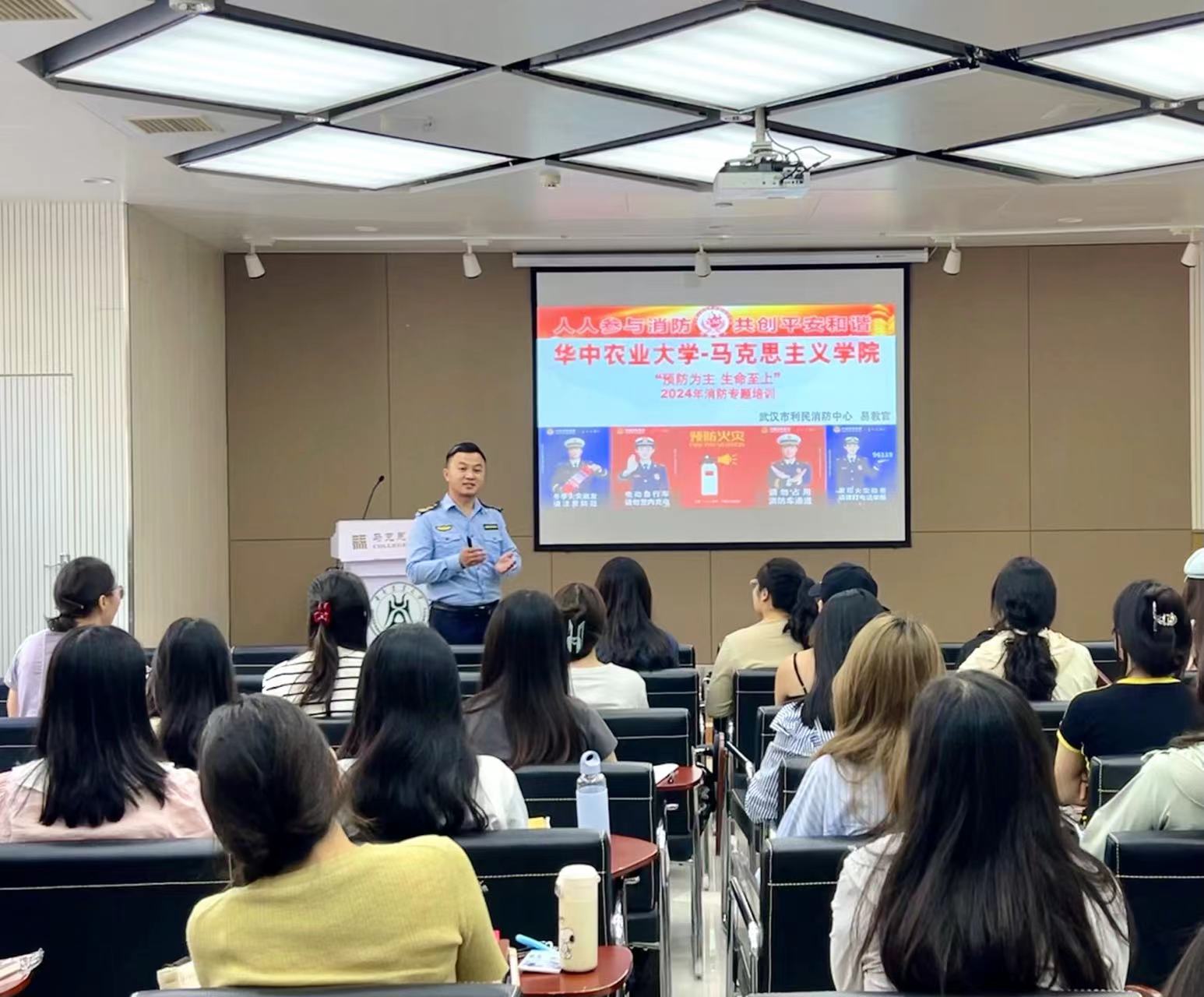 武汉市利民消防宣传中心易教官以“消防安全教育”为主题,以生动的语言向员工们介绍了基本的消防安全知识,包括如何识别火灾隐患、正确使用灭火器以及在紧急情况下如何逃生自救等实用技巧;结合近年来国内外发生的多起重大火灾案例,通过视频播放、图片展示等形式,深入浅出地剖析了火灾发生的原因及其带来的惨痛教训。此外,他还特别强调了日常生活中容易忽视的安全细节,比如不乱扔烟头、不在宿舍内使用大功率电器等,提醒同学们时刻保持警惕,防患于未然。