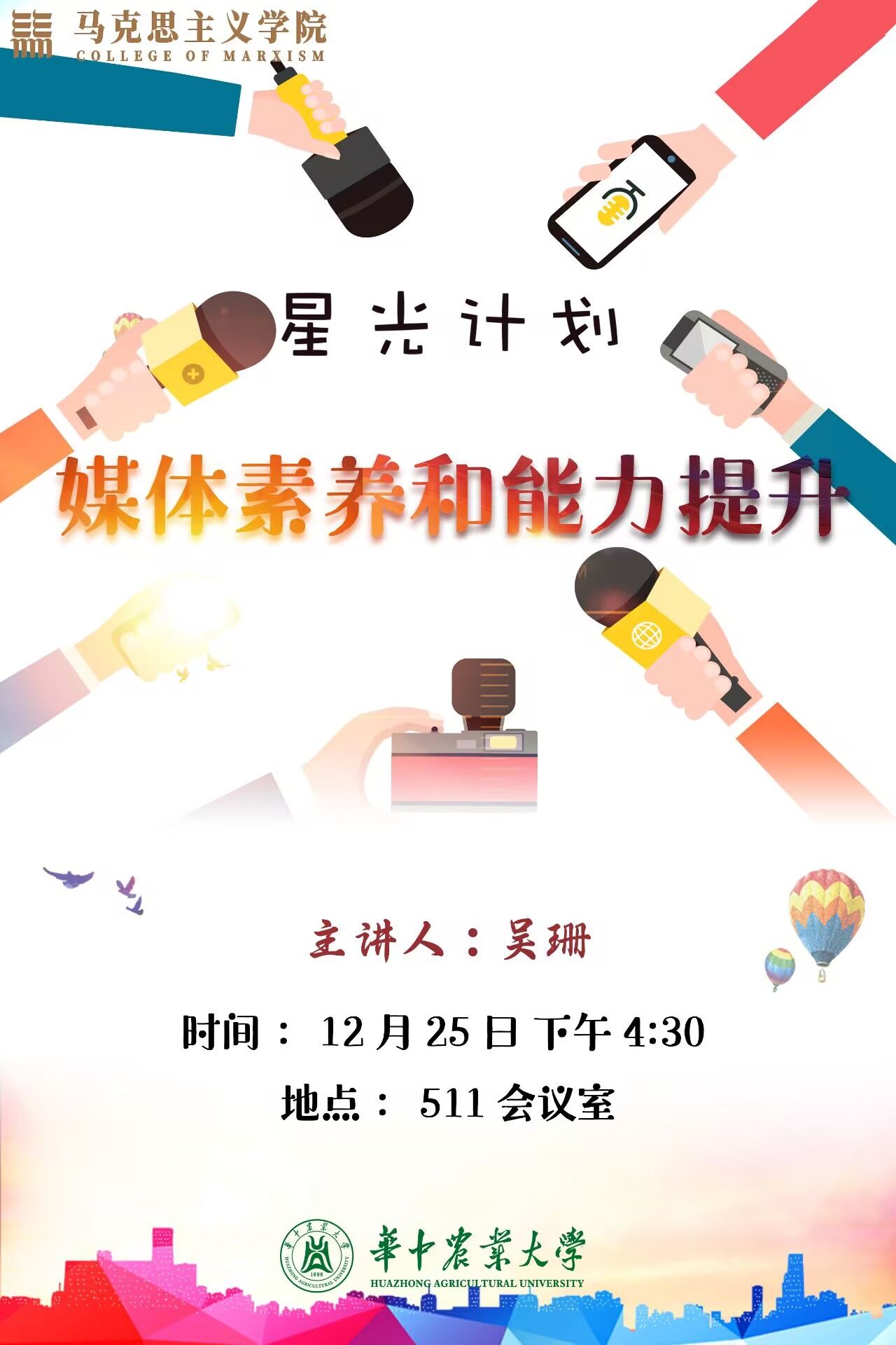 12月25日下午,伟德中国官网入口在创业楼511会议室开展了“星光计划:媒体素养和能力提升”业务培训。培训邀请了公司党委副书记吴珊担任主讲人,本次活动旨在提升师生在新闻写作与新闻摄影方面的专业素养,增强媒体实践能力。