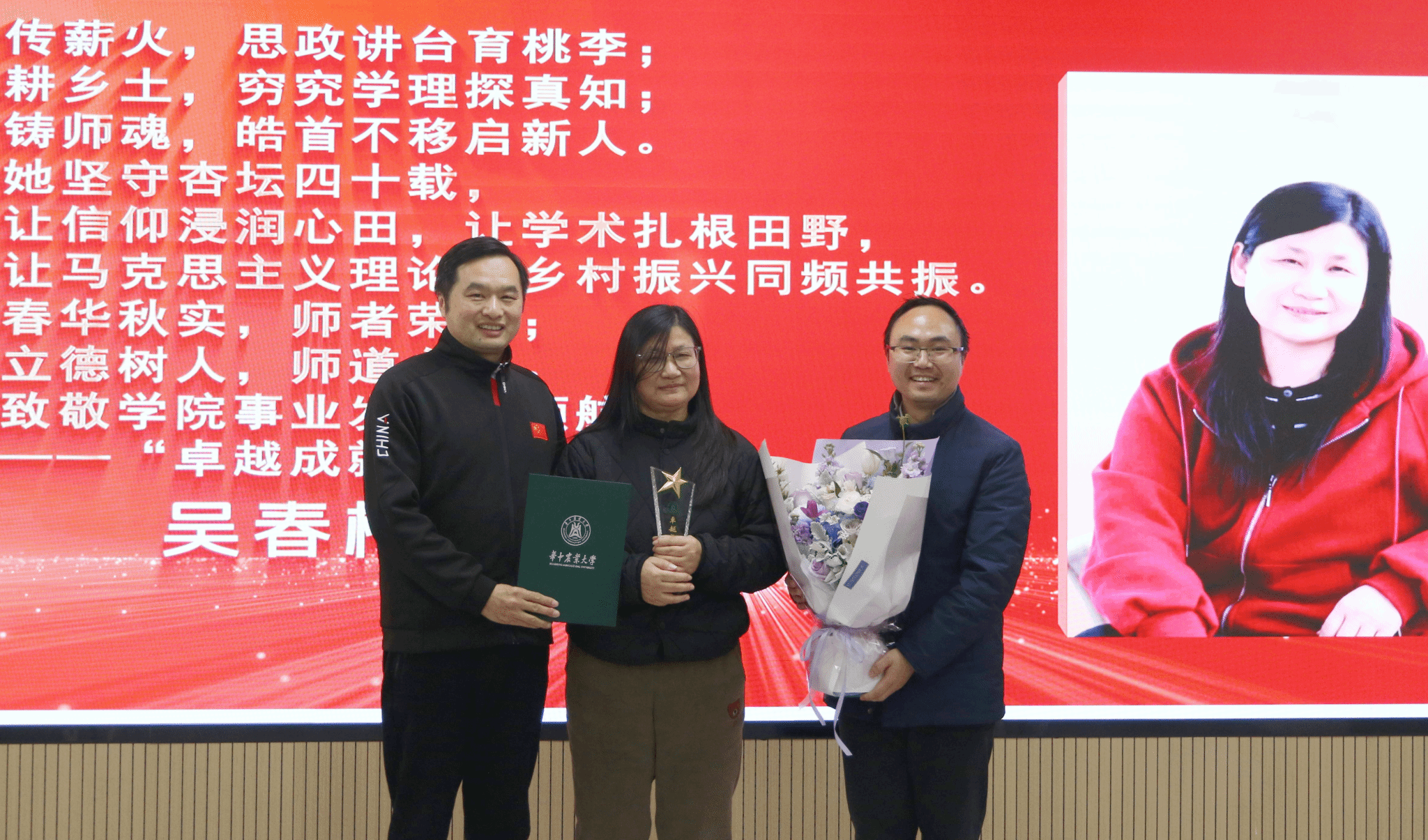 会议伊始,刘三宝揭晓了“卓越成就奖”的获得者——吴春梅老师,她坚守杏坛四十载,让信仰浸润心田,让学术扎根田野,让马克思主义理论与乡村振兴同频共振,为公司事业发展做出了卓越贡献。王从严为吴春梅老师颁发奖杯和荣誉证书,青年教师石绍成代表公司献花。随后,吴春梅老师讲述了其四十多年从教的经历,她说:“没有传承的事业不是真正的事业”,并对青年教师们提出谆谆嘱咐,要珍惜站讲台的时光,扎根教坛,做员工成长路上的“燃灯者”。