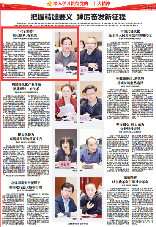 编者按:党的二十大是在全党全国各族人民迈上全面建设社会主义现代化国家新征程、向第二个百年奋斗目标进军的关键时刻召开的一次十分重要的大会。学习宣传贯彻党的二十大精神,是当前和今后一个时期全党全国的首要政治任务。11月18日,武汉市社科理论界深入学习贯彻党的二十大精神座谈会召开,来自在汉高校、党校、社科院等社科理论界专家代表作学习交流发言。长江日报现摘要刊发部分发言。